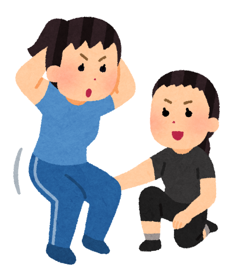 スクワット:太ももやお尻を鍛える定番種目。 正しいフォームで行うと体幹も鍛えられます。